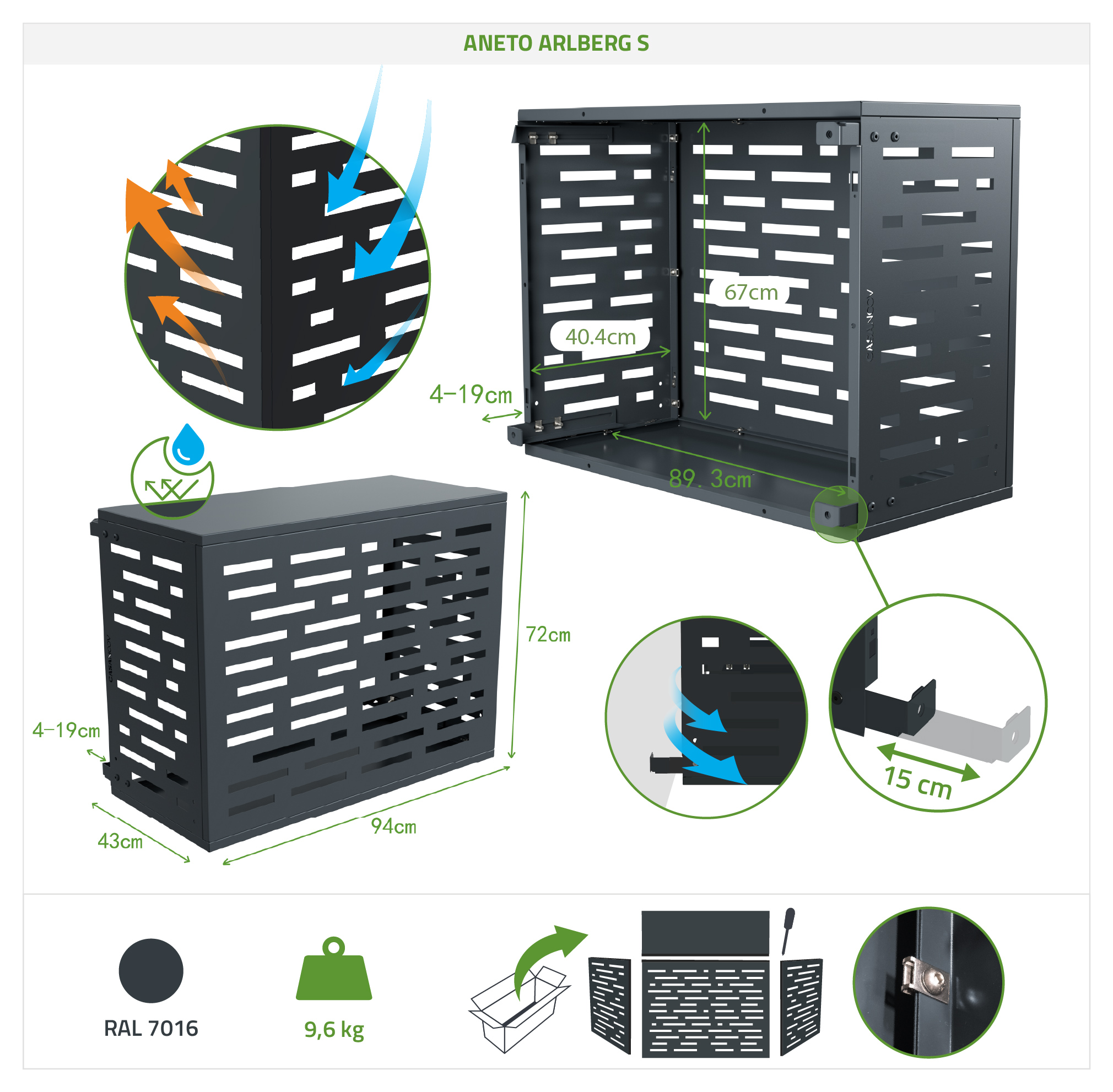 De Aneto Arlberg aluminium airconditionerhoes maakt indruk met zijn strakke design en opengewerkte grafische lijnen die een eigentijdse touch aan uw buitenruimte geven. De aluminium constructie zorgt voor een laag gewicht en optimale weerbestendigheid, en vereenvoudigt tevens de installatie en het onderhoud. Deze functionele en esthetisch aantrekkelijke hoes voor uw airconditioner/warmtepomp verbergt uw unit discreet voor een harmonieuze en verzorgde uitstraling. Deze moderne, decoratieve aluminium afdekking is ontworpen om uw gevels te verfraaien en tegelijkertijd uw apparatuur effectief te beschermen.
