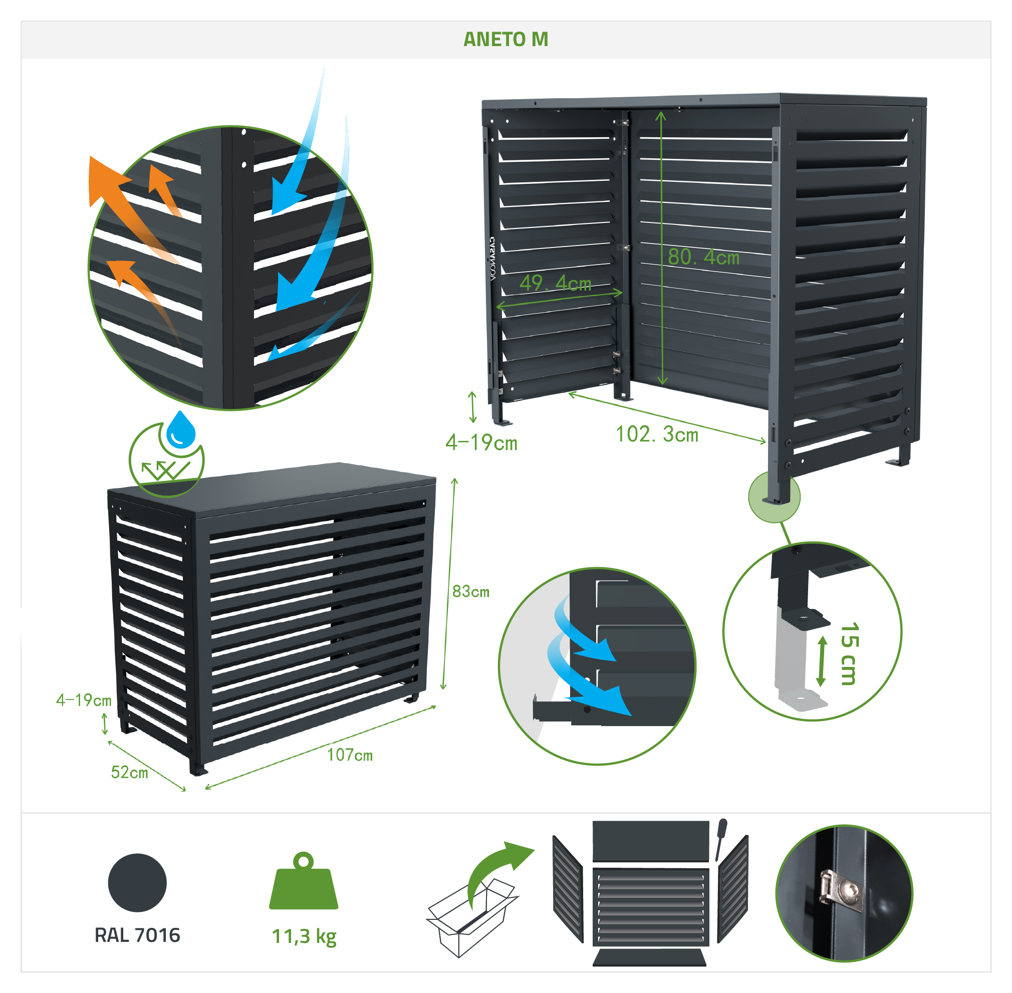 De Aneto aluminium airconditionerhoes maakt indruk met zijn lamellenontwerp en biedt een discrete en elegante uitstraling. De aluminium constructie zorgt voor een verfijnde afwerking, opmerkelijk licht gewicht en uitstekende weerbestendigheid, ideaal voor langdurig gebruik buitenshuis. Dankzij de geperforeerde lamellen zorgt deze airconditioner-/warmtepomphoes voor goede ventilatie van het apparaat, terwijl het discreet wordt verborgen. Een model met een eenvoudige en tijdloze stijl, perfect passend bij alle soorten buitenruimtes. De lamellen van deze airconditionerhoes zijn omkeerbaar; ze kunnen naar boven of naar beneden gericht worden gemonteerd, afhankelijk van de positionering van uw airconditioner of warmtepomp.