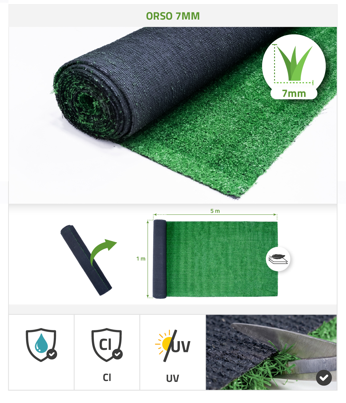 Met zijn korte vezels van 7 mm biedt de ORSO-serie een kunstgrasrol met een strakke, gestructureerde uitstraling, ideaal voor een stijlvolle, moderne buitenruimte. De hoogte maakt het een perfecte oplossing voor terrassen, balkons of drukbezochte plekken waar minimaal onderhoud en een uniforme uitstraling essentieel zijn. Dit 7mm kunstgras maakt indruk met zijn eenvoudige installatie, duurzaamheid en consistent onberispelijke uitstraling, zelfs na meerdere seizoenen.